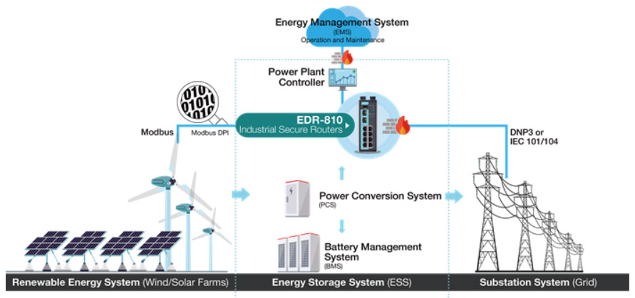 - The EDR-810 industrial secure routers build the security boundary, and its Modbus DPI function safeguards the Modbus communication in between the systems.