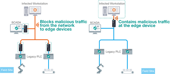 protect industrial networks by blocking malicious traffic from the network to edge devices and by
