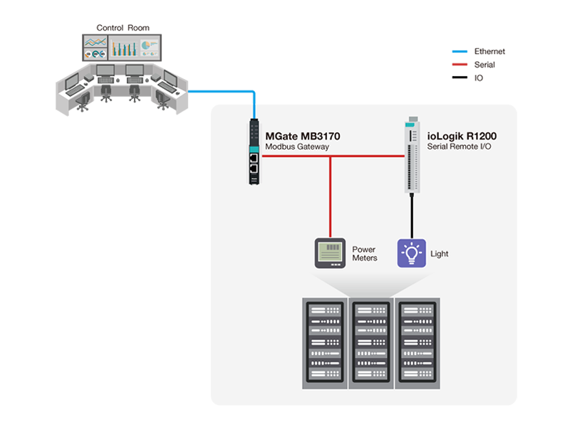 - Built-in Modbus RTU client to collect serial power, making I/O and meters data collection via Ethernet possible